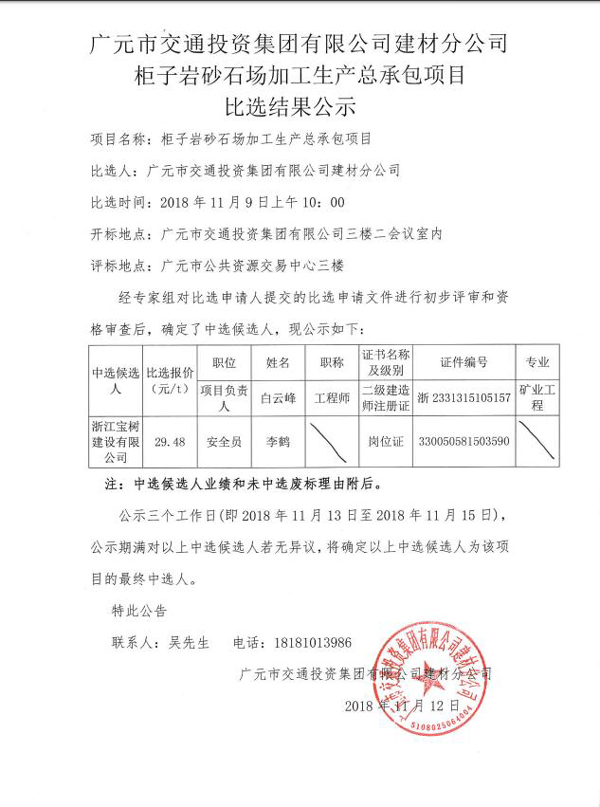 廣元市交通投資集團有限公司建材分公司柜子巖砂石場(chǎng)加工生產(chǎn)總承包項目比選結果公示