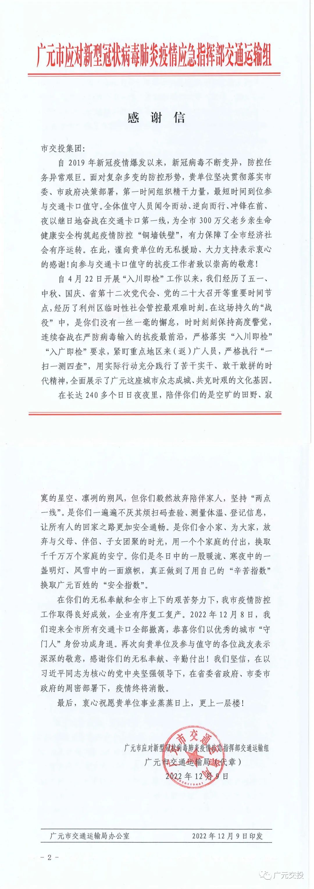 近日,廣元市應對新型冠狀病毒肺炎疫情應急指揮部交通運輸組發(fā)來(lái)感謝信,對廣元交投集團在防疫抗疫期間的工作表示了感謝。